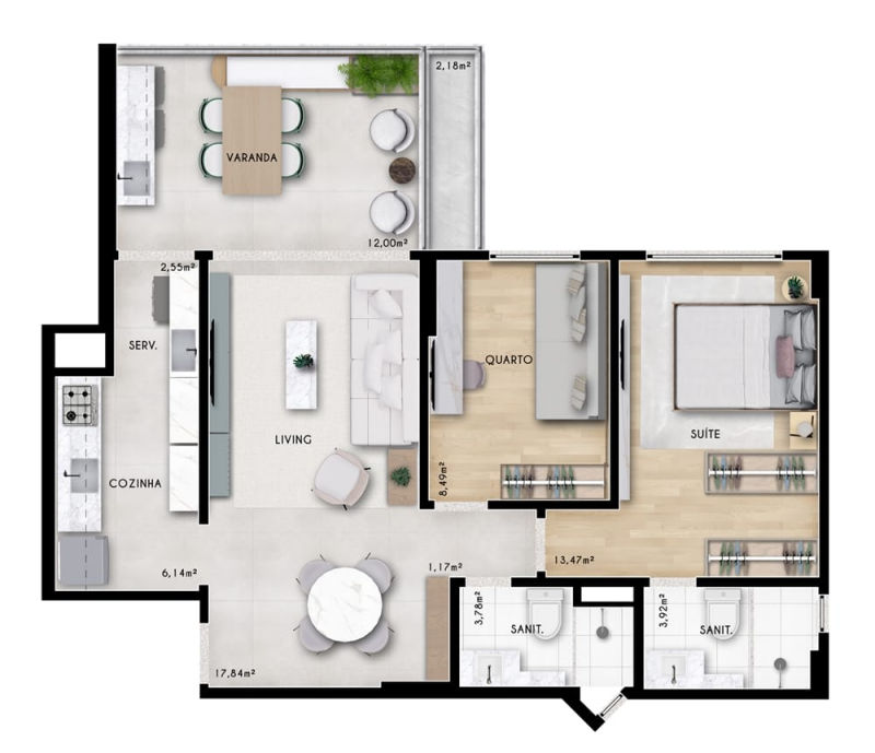 Belíssimo imóvel com área privativa de 72m² e uma ótima ventilação, além de contar com 1 vaga de garagem coberta. Além disso, o apartamento fica localizado no 5º andar do edifício e conta com a seguinte planta interna:
