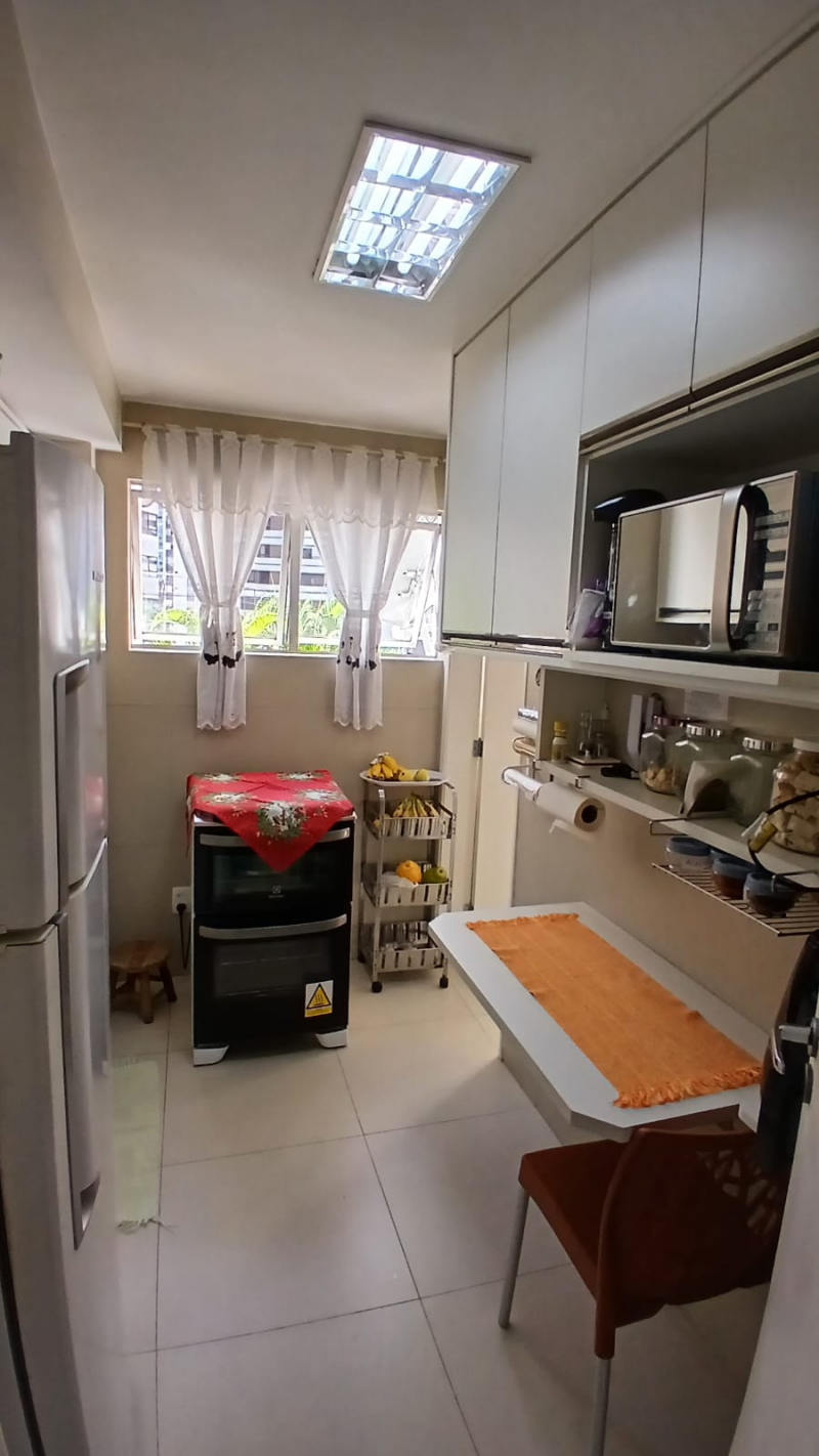 Apartamento disponível para alugar por temporada, composto por um 2/4 sendo uma suíte, banheiro social, cozinha, sala ampla, banheiro de serviço e área de serviço, tendo armários em quase todos os cômodos. Conta com área privativa de 80m², 1 vaga de garagem e fica no 5º andar do prédio.