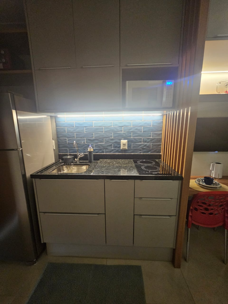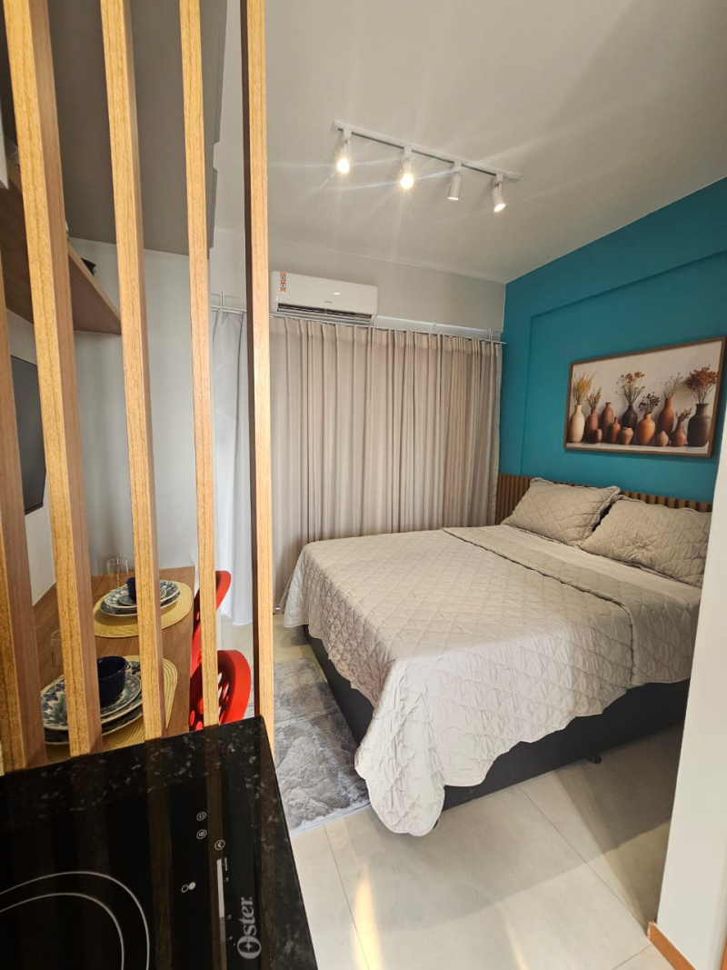 Apartamento estilo studio impecável, nascente, mobiliado e com vista para o mar, com aproximadamente 20m² de área privativa e com móveis de excelente qualidade.